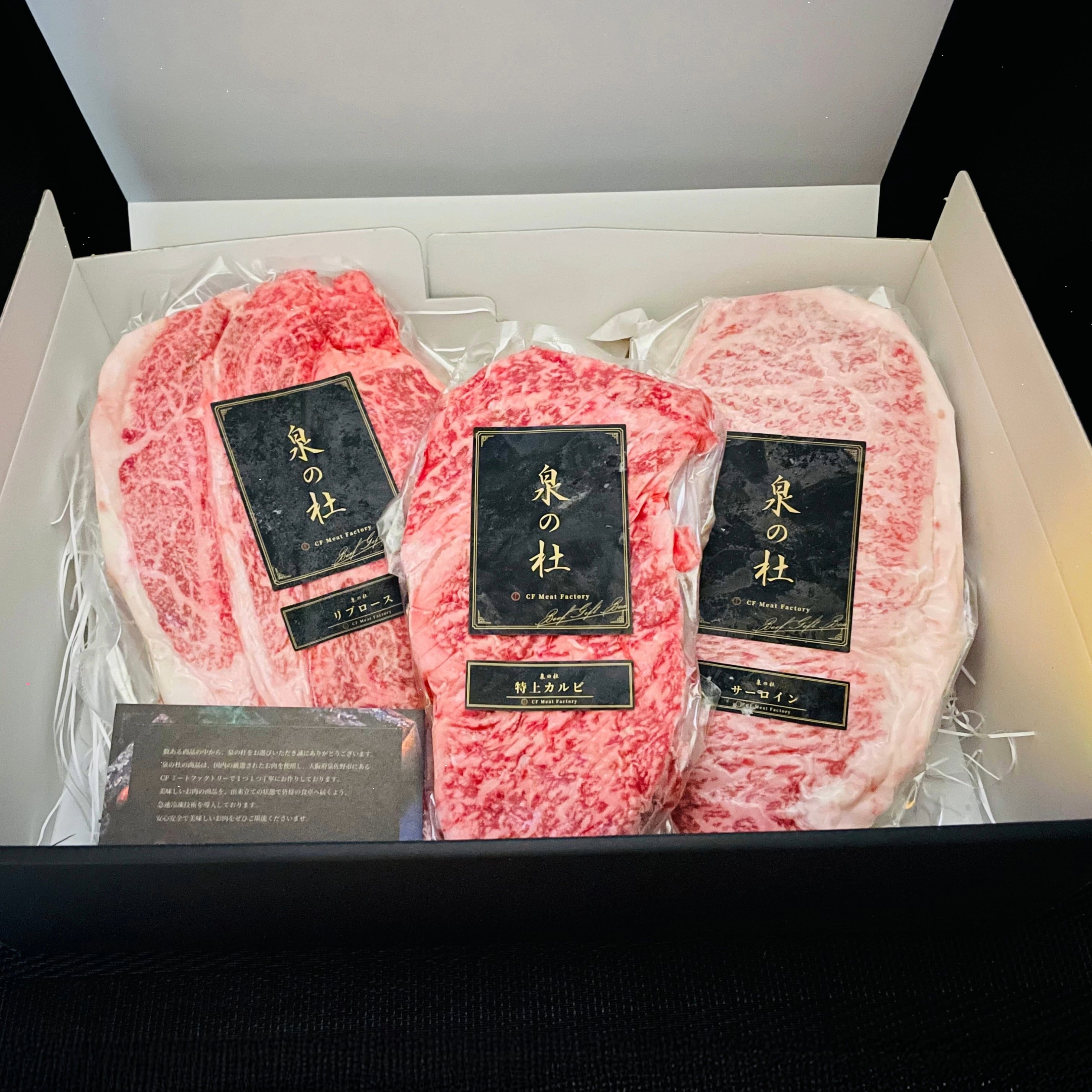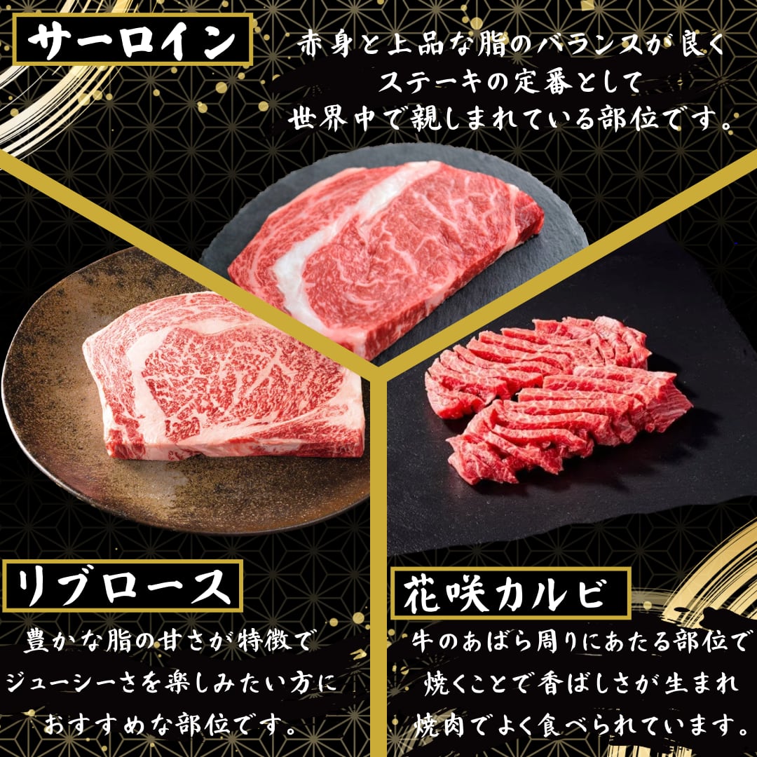 厳選された黒毛和牛A5/A4等級を使用した豪華なステーキセットです。サーロインの柔らかさ、リブロースの濃厚な旨み、そして花咲カルビのジューシーな食感が一度に楽しめる贅沢な商品です。肉質のきめ細やかさと芳醇な香りは、お食事を特別なものに演出し、心に残るひとときを提供します。